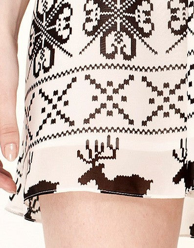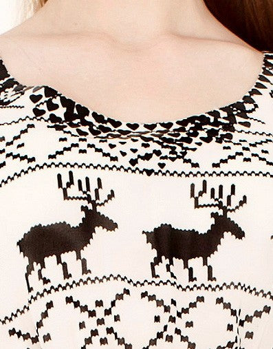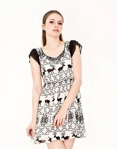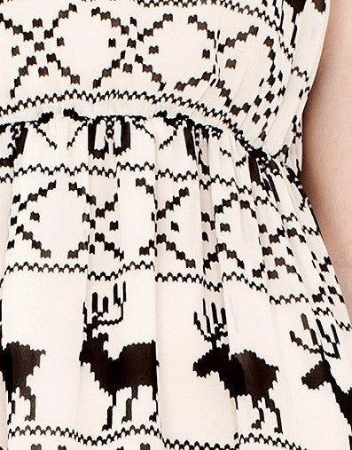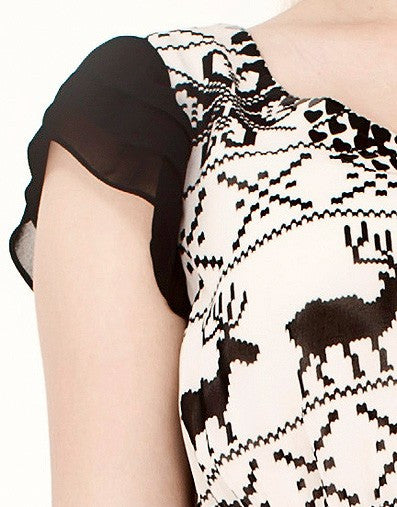 The1727 exclusive limited edition Nordic print chiffon, triple layer frill sleeve, neck straps tie at back for adjustable fit, high-waist to disguise hips and the stomach area, sheared waist to emphasize the waistline.