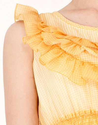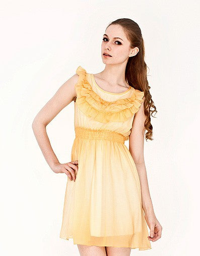 The1727 exclusive omber checked chiffon, tiered frill neckline, sheared waist empire silhouette emphasizes the waistline, an adorable dress, perfect for summer vacation!